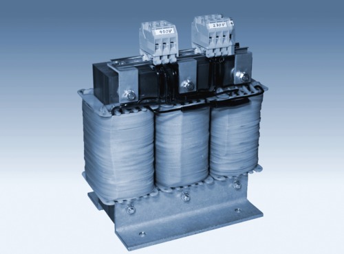 Open frame three phase transformers 400 V / 200 V, 208 V, suitable for supplying 200 V (or 208 V / 480 V) devices in 400 V power mains (e.g. supplying US devices in Europe), power from 500 VA up to 100 kVA, optional with housing (up to IP54), special design possible